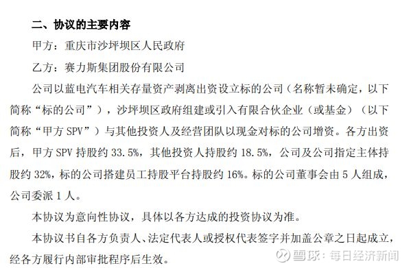 《合作协议》显示,赛力斯以蓝电汽车相关存量资产剥离出资设立标的公司(名称暂未确定),沙坪坝区政府组建或引入有限合伙企业与其他投资人及经营团队以现金对标的公司增资。各方出资后,沙坪坝区政府相关方持股约33.5%,其他投资人持股约18.5%,赛力斯及其指定主体持股约32%。同时,标的公司搭建员工持股平台,持股约16%。