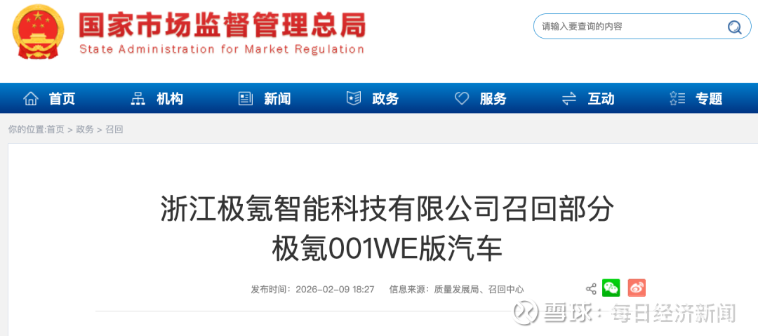 2月9日,记者从据市场监管总局获悉,日前,浙江极氪智能科技有限公司根据《缺陷汽车产品召回管理条例》和《缺陷汽车产品召回管理条例实施办法》的要求,受浙江吉利汽车有限公司委托向国家市场监督管理总局备案了召回计划。