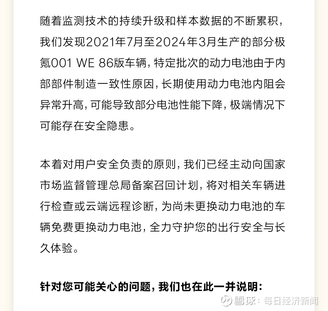 本次召回范围内的部分车辆,由于高压动力电池的部件制造一致性原因,长期使用动力电池内阻会异常升高,可能导致部分动力电池性能下降,极端情况下可能导致动力电池热失控,存在安全隐患。