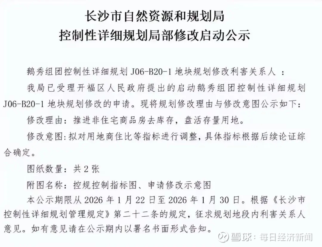 根据最初的片区规划,项目商业部分有望打造成开福北的新地标。但日前长沙市自然资源和规划局发布的“鹅秀组团控制性详细规划J06-B20-1地块规划修改”启动公示显示,为推进非住宅商品房去库存,“拟对用地商住比等指标进行调整”,具体指标将根据后续论证综合确定。