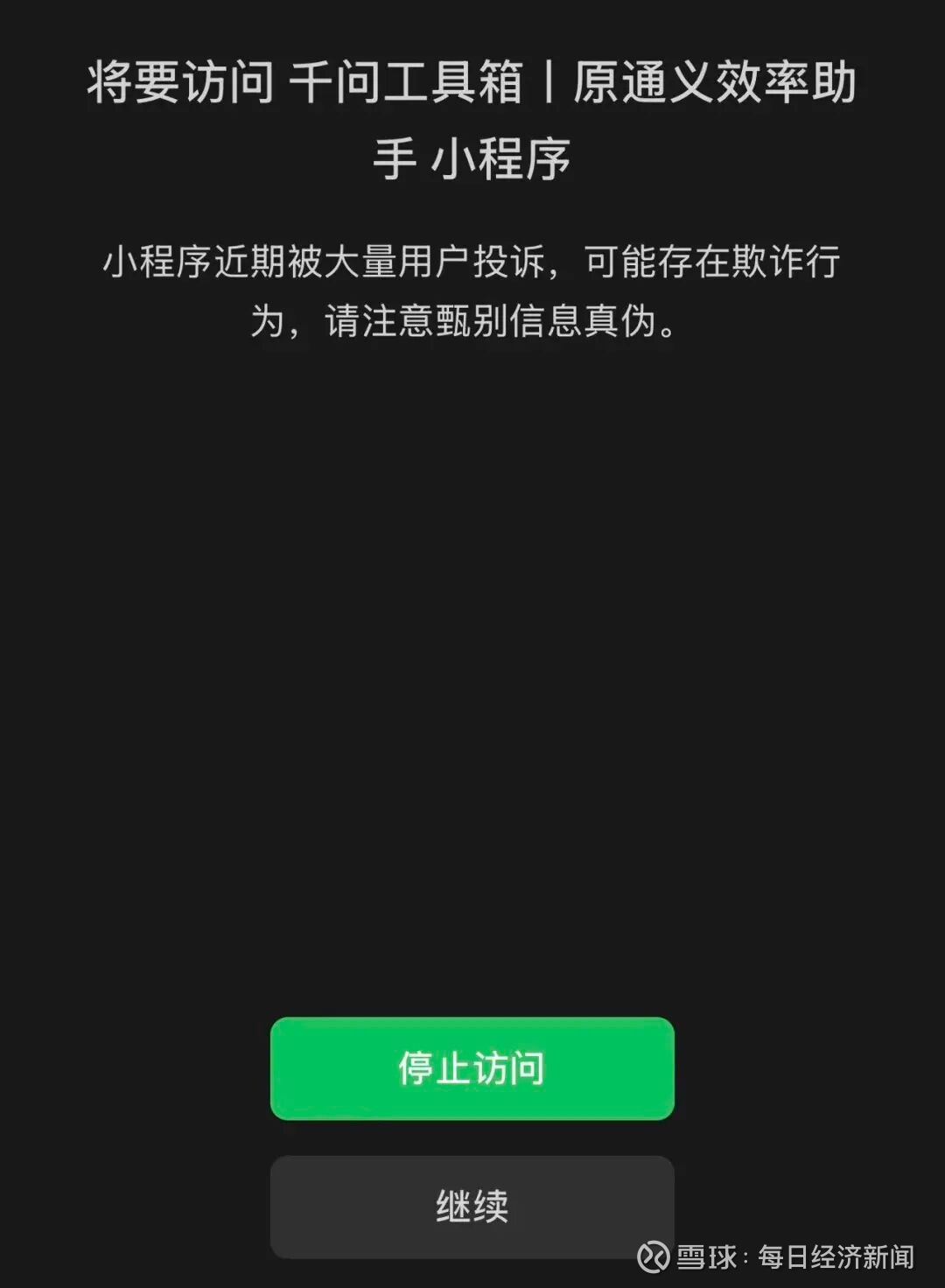 2月9日,阿里“千问工具箱|原通义效率助手”小程序被微信官方限制,打开时会弹出警示窗口。