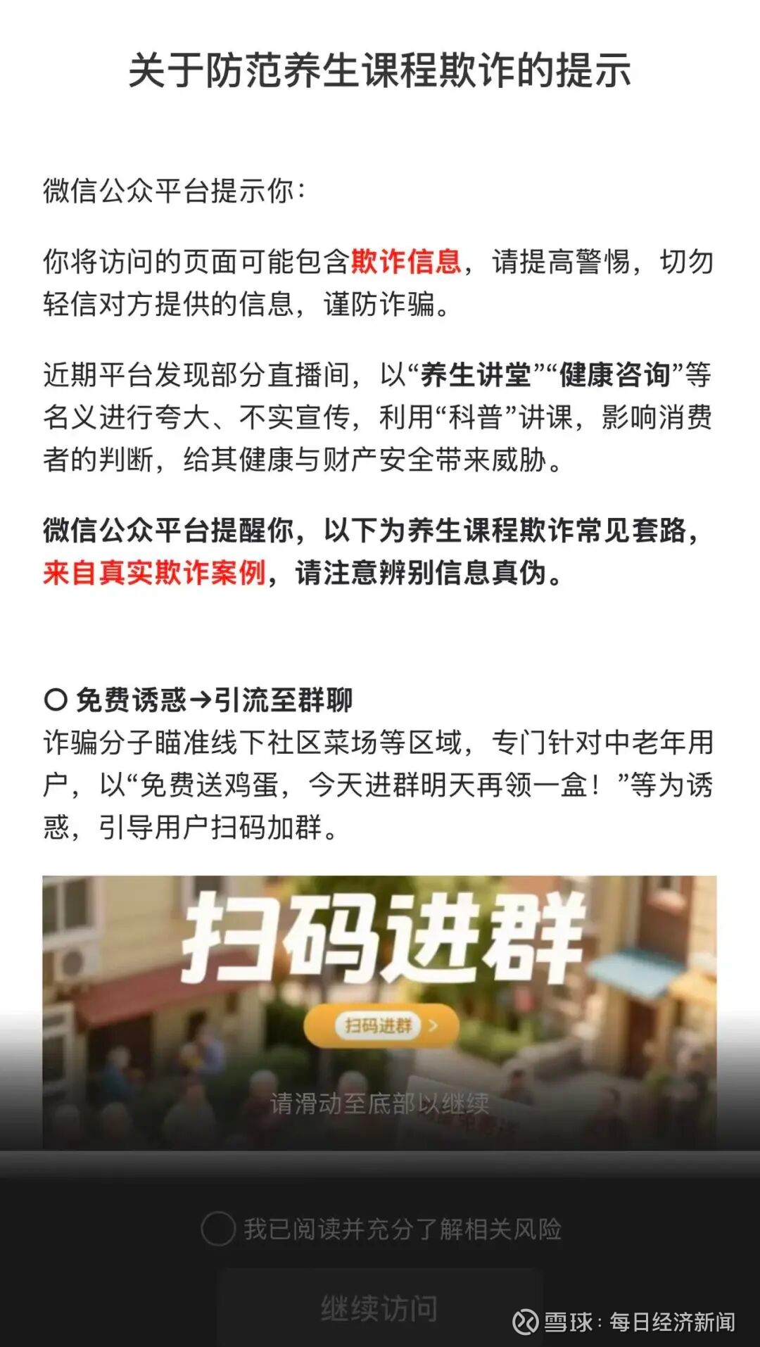 若选择继续访问,系统将再次弹出“关于防范养生课程欺诈的提示”的相关文章,用户只有浏览并勾选“已阅读并充分了解相关风险”后才能打开小程序。