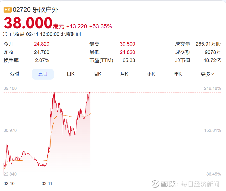 该股以12.25港元定价发行,上市当日,乐欣户外(02720.HK)报收24.78港元/股,大涨102.29%,次日又涨53.35%,上市两天涨超200%,总市值飙升至48.72亿港元。