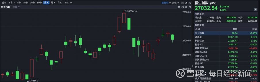截至收盘,恒生指数报27032.54点,下跌233.84点,跌幅0.86%。