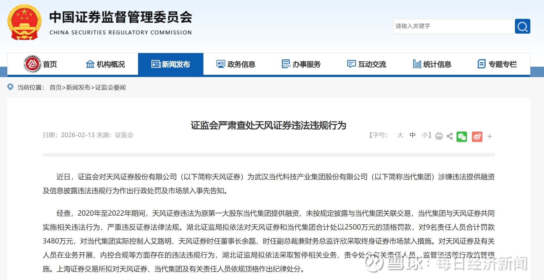 据证监会官网2月13日消息,近日,证监会对天风证券股份有限公司(以下简称天风证券)为武汉当代科技产业集团股份有限公司(以下简称当代集团)涉嫌违法提供融资及信息披露违法违规行为作出行政处罚及市场禁入事先告知。