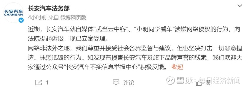 2月13日,长安汽车法务部发文称,近期,长安汽车就自媒体“武当云中客”、“小明同学看车”涉嫌网络侵权的行为,向法院提起诉讼,现已立案受理。