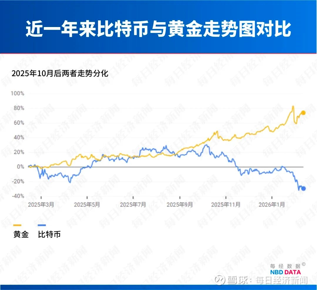 比特币曾被冠以“数字黄金”之名。但自2025年10月比特币创下历史高点以来一直持续“失血”,黄金却因避险需求数度走向新高,两者走势的背离,揭示出加密货币叙事根基的动摇。