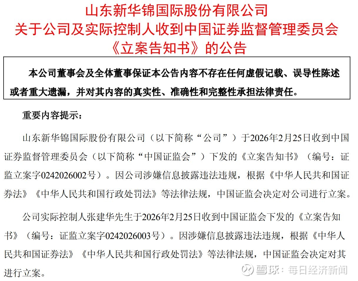 2月25日晚间,ST新华锦集中披露两份公告:一方面,因控股股东及其关联方高达4.06亿元的非经营性资金占用未能在责令改正期限内完成整改,ST新华锦股票自2月26日开市起停牌;另一方面,公司及实际控制人张建华同日收到中国证监会下发的《立案告知书》,因涉嫌信息披露违法违规被双双立案调查。