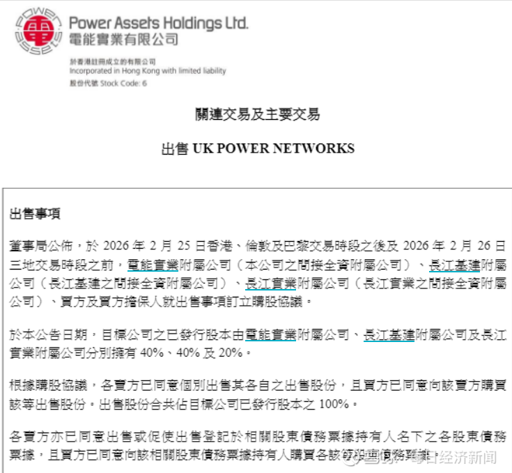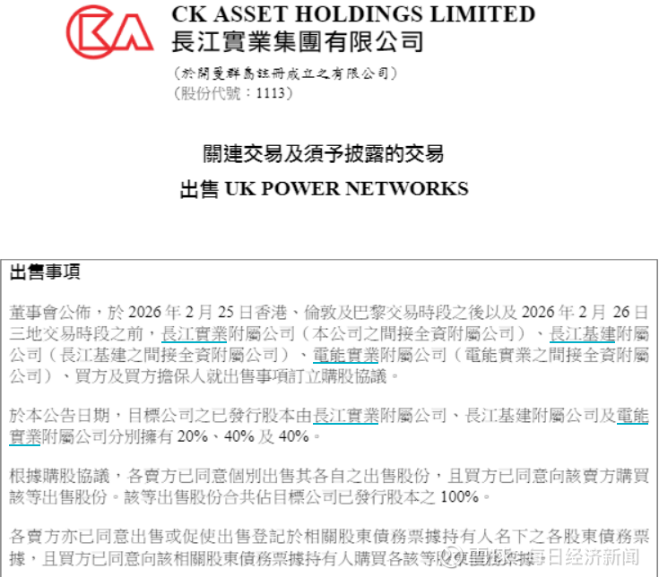 2月26日,李嘉诚旗下长和系三家公司长江基建集团、电能实业及长实集团在港交所发布公告,已与法国公用事业企业Engie旗下子公司Engie UK 2026 Limited订立协议,出售三方合共持有的英国电网公司UK Power Networks Holdings Limited100%股权,套现逾1100亿港元。