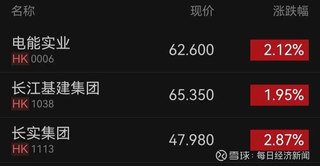 截至发稿,长江基建集团涨1.95%,电能实业涨2.12%,长实集团涨2.87%。