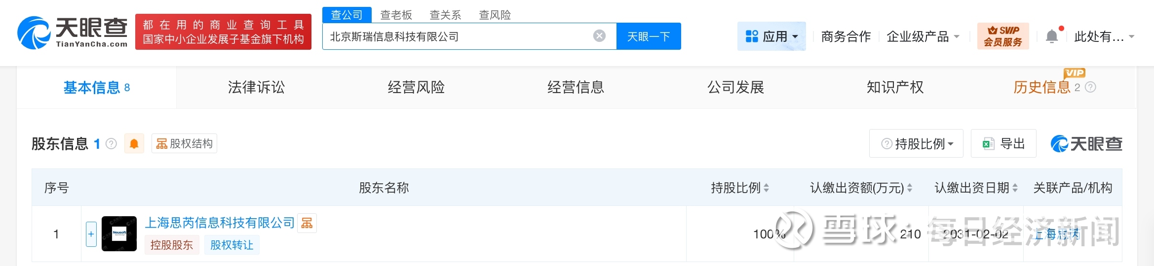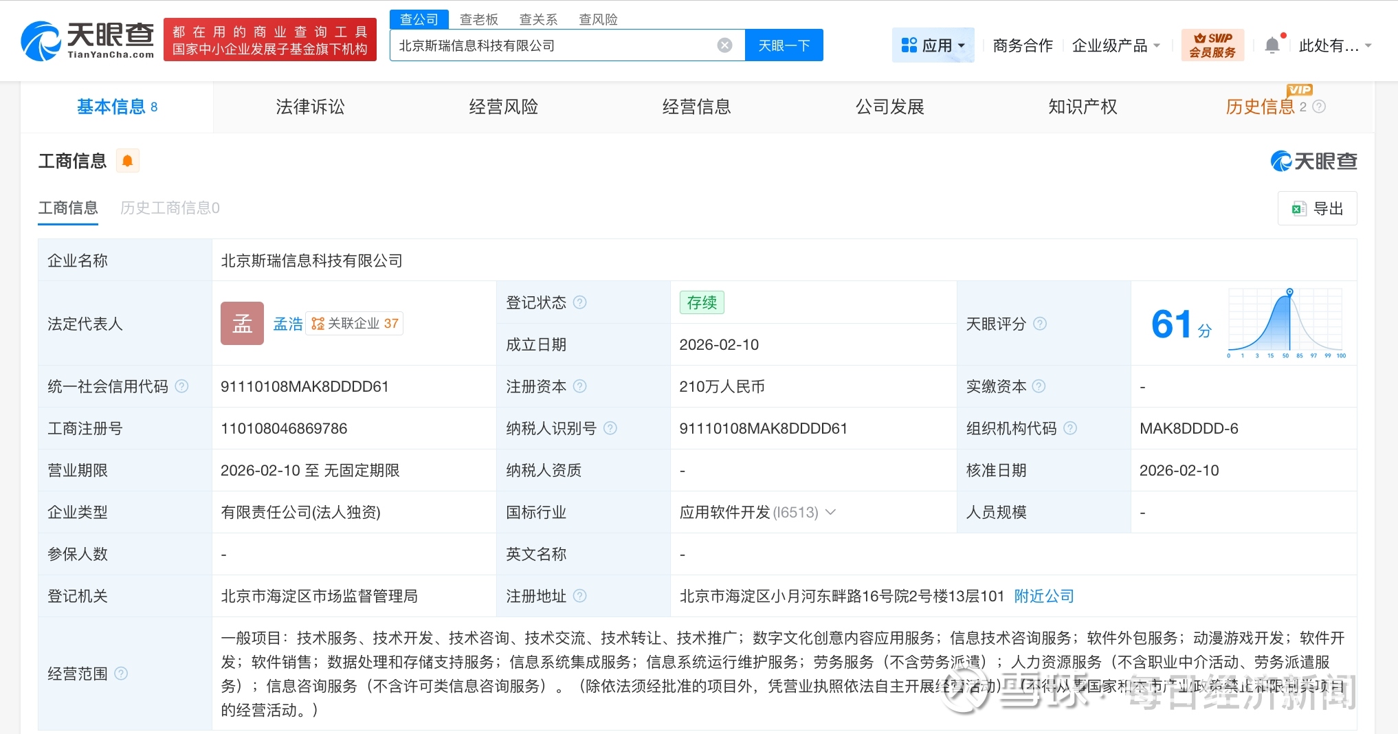 每经AI快讯,天眼查App显示,近日,北京斯瑞信息科技有限公司成立,法定代表人为孟浩,注册资本210万元人民币,经营范围含数字文化创意内容应用服务、信息技术咨询服务、软件外包服务、动漫游戏开发、数据处理和存储支持服务、信息系统集成服务、信息系统运行维护服务、信息咨询服务等,由东软集团旗下上海思芮信息科技有限公司全资持股。