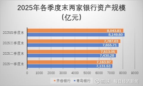据最新披露的业绩快报,截至2025年末,两家银行资产规模均迈上8000亿元门槛,其中青岛银行在去年第四季度扩增约494亿元,几乎是齐鲁银行同季度增量的两倍,由此在去年末实现资产规模反超,得以稳住规模首位。