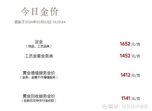 记者注意到,截至3月3日下午2点39分,周大福官网显示,工艺金章金条类价格为1452元/克,黄金回收价格为1141元/克。