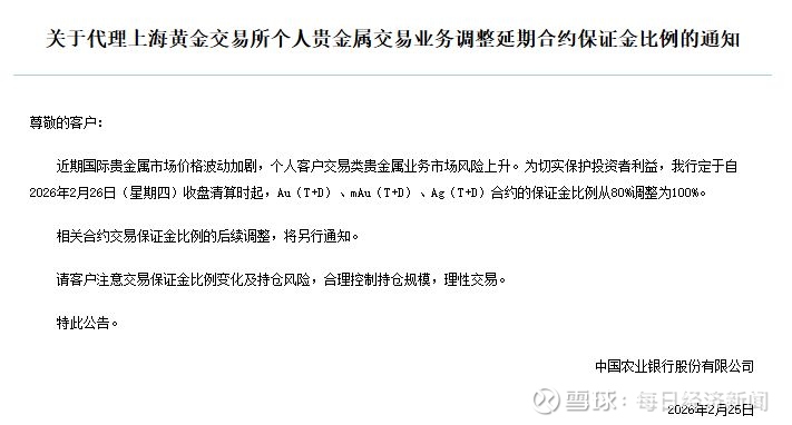 如工商银行2月25日公告称,自2026年2月27日(星期五)收盘清算时起,该行代理个人客户Au(T+D)、mAu(T+D)、Au(T+N1)、Au(T+N2)、NYAuTN06、NYAuTN12等合约的标准交易保证金比例由80%调整为100%,差异化保证金作同向、同幅度调整;该行代理个人客户Ag(T+D)合约的标准交易保证金比例由80%调整为100%,差异化保证金作同向、同幅度调整。