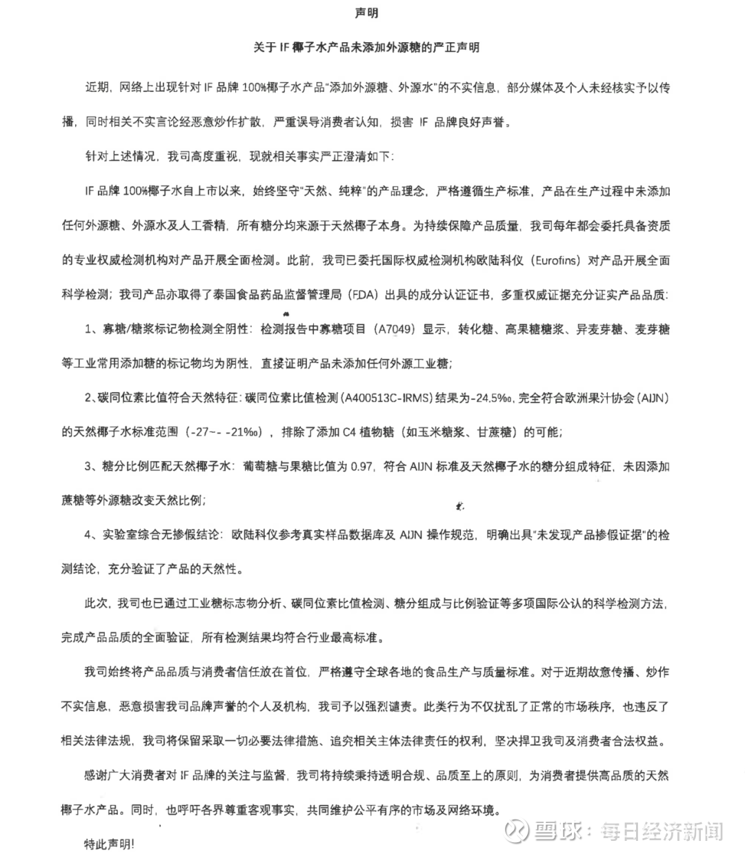 声明中称,IF品牌100%椰子水自上市以来,始终坚守“天然,纯粹”的产品理念,严格遵循生产标准,产品在生产过程中未添加任何外源糖、外源水及人工香精,所有糖分均来源于天然椰子本身。