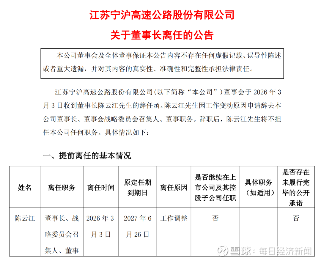 3月3日,江苏宁沪高速公路股份有限公司(下称宁沪高速或公司)公告,董事会于2026年3月3日收到董事长陈云江的辞任函。