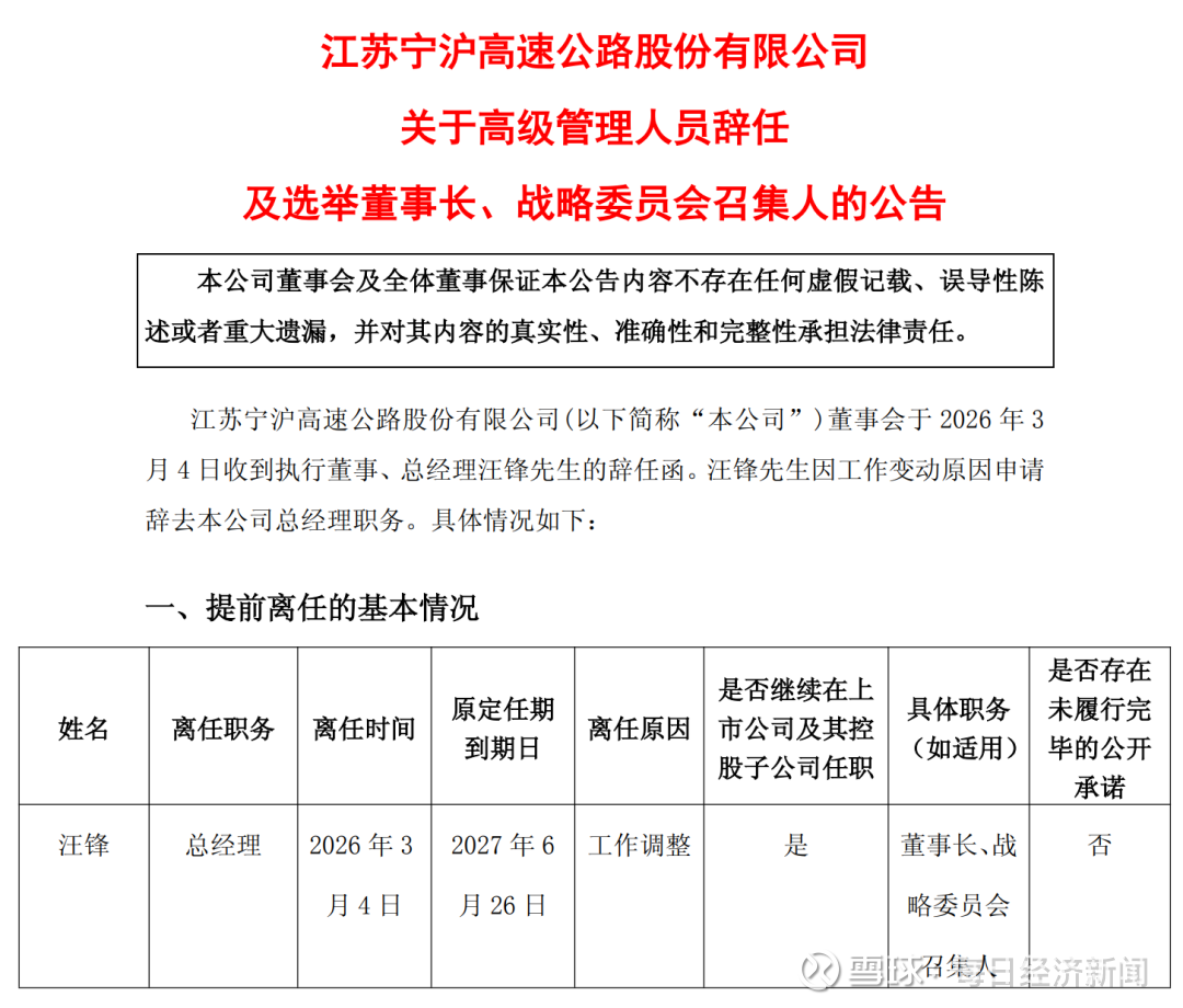 3月4日,宁沪高速公告显示,董事会于2026年3月4日收到执行董事、总经理汪锋的辞任函。汪锋因工作变动原因申请辞去本公司总经理职务。同一天,公司第十一届董事会第十九次会议,选举汪锋担任第十一届董事会董事长、战略委员会召集人,任期与本届董事会一致。
