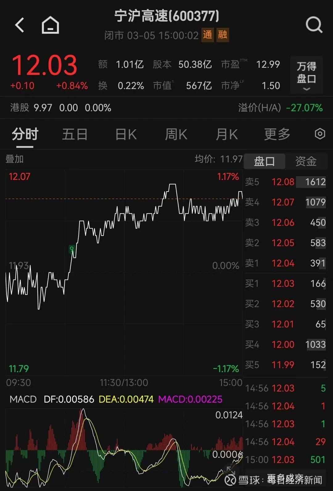 截至3月5日收盘,宁沪高速股价报12.03元,总市值567亿元。