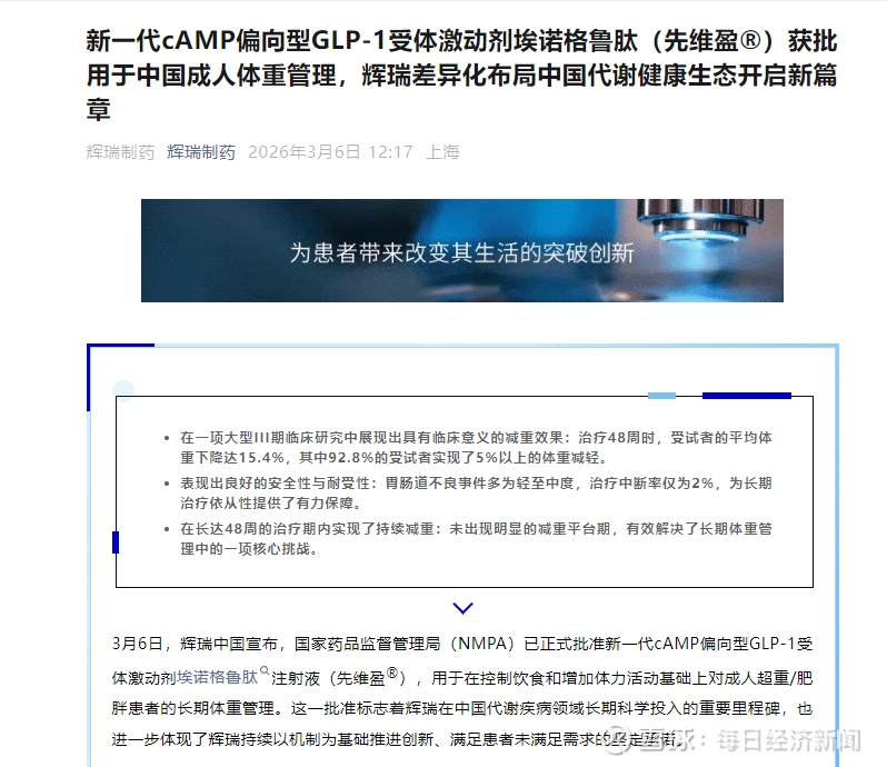 每经AI快讯,3月6日,辉瑞中国在官微宣布,国家药品监督管理局(NMPA)已正式批准新一代cAMP偏向型GLP-1受体激动剂埃诺格鲁肽注射液(先维盈®),用于在控制饮食和增加体力活动基础上对成人超重/肥胖患者的长期体重管理。