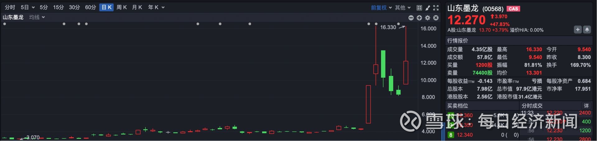 3月9日,山东墨龙(HK00568)H股股价一度大涨,早盘最高报16.330港元,涨幅接近翻番,截至当日收盘,其股价为10.380港元/股,涨幅为25.06%,成交额为91.01亿港元,换手率289.94%。