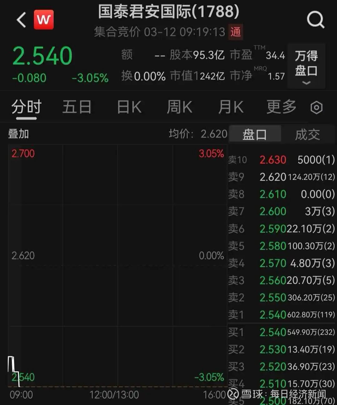 截至发稿,国泰君安国际跌3.05%,报2.54港元/股,市值约为242亿港元。