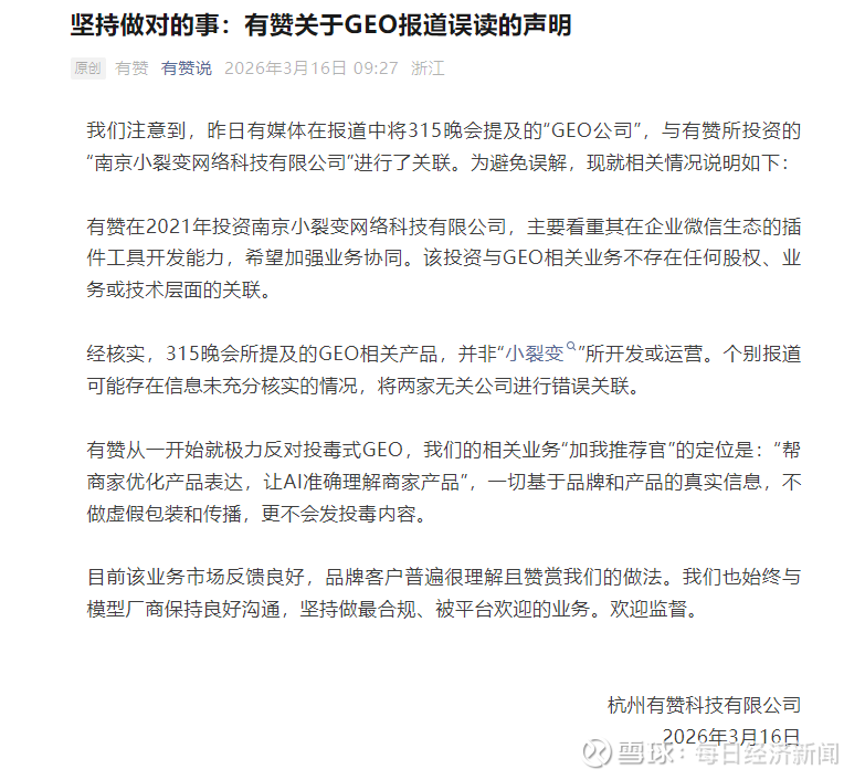 每经AI快讯,3月16日,有赞(08083.HK)官方发布声明称,注意到昨日有媒体在报道中将3·15晚会提及的“GEO公司”,与有赞所投资的“南京小裂变网络科技有限公司”进行了关联。经公司核实,3·15晚会所提及的GEO相关产品,并非“小裂变”所开发或运营。个别报道可能存在信息未充分核实的情况,将两家无关公司进行错误关联。