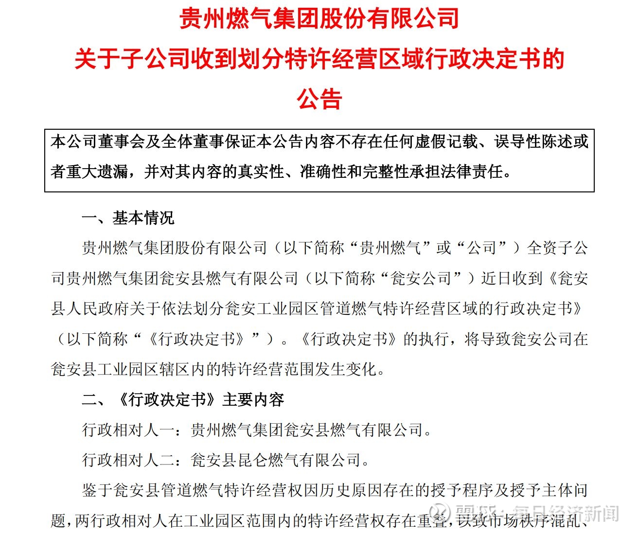 3月16日盘后,贵州燃气(SH600903,股价6.87元,市值79.01亿元)公告称,其全资子公司贵州燃气集团瓮安县燃气有限公司(以下简称“瓮安公司”)收到《瓮安县人民政府关于依法划分瓮安工业园区管道燃气特许经营区域的行政决定书》(以下简称《行政决定书》)。