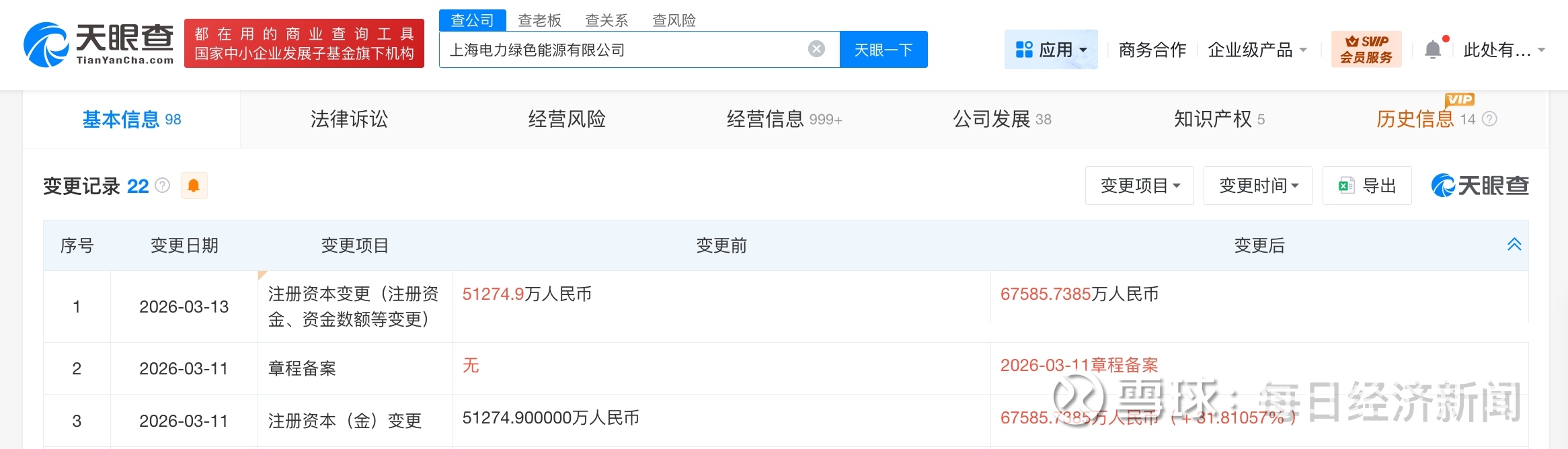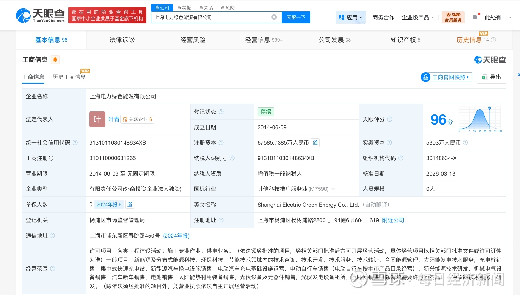 每经AI快讯,天眼查工商信息显示,近日,上海电力绿色能源有限公司发生工商变更,注册资本由约5.1亿元人民币增至约6.8亿元人民币,增幅约32%。该公司成立于2014年6月,法定代表人为叶青,经营范围包括新能源及分布式能源科技、环保科技、节能技术领域内的技术咨询、技术开发、技术服务、技术转让,太阳能发电技术服务等。股东信息显示,该公司由上海电力(600021)全资持股。