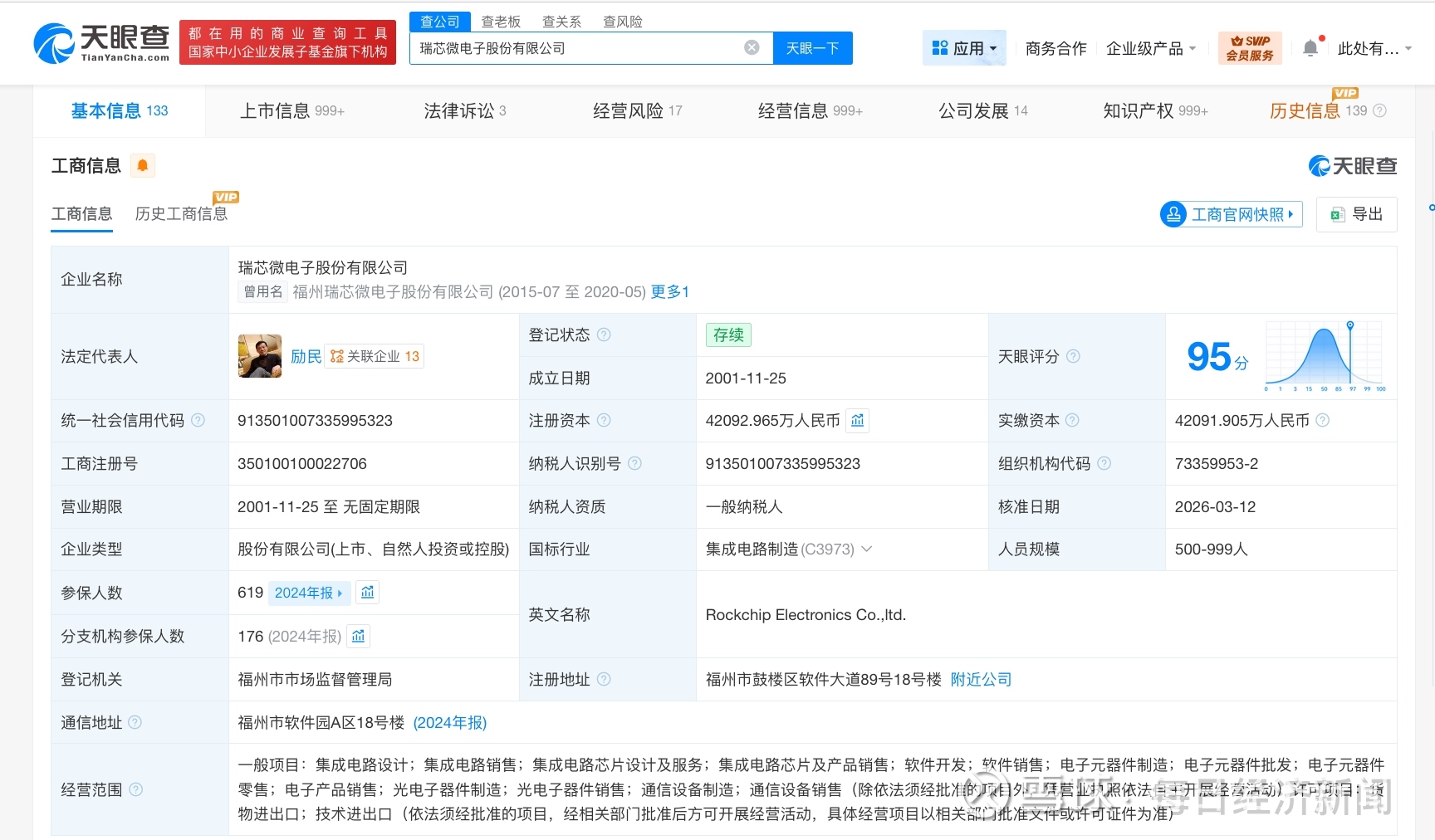 每经AI快讯,天眼查工商信息显示,近日瑞芯微(603893)发生工商变更,注册资本由约4.18亿元人民币增至约4.21亿元人民币。瑞芯微电子股份有限公司成立于2001年11月,法定代表人为励民,经营范围含集成电路设计、集成电路销售、集成电路芯片设计及服务、集成电路芯片及产品销售等。股东信息显示,该公司由励民、黄旭等共同持股。