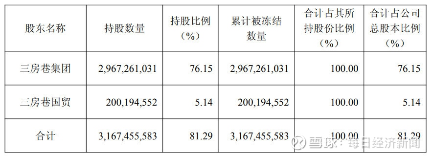 该风险源于公司控股股东三房巷集团及其一致行动人江苏三房巷国际贸易有限公司(以下简称三房巷国贸)所持股份已全部处于“冻结”与“质押”状态。早在2026年2月26日的公告中,公司就披露了这一情况。公告显示,三房巷集团及三房巷国贸合计持有的公司股份数为31.67亿股,占公司总股本的81.29%,已全部被司法冻结。