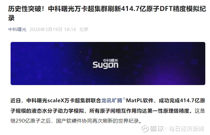 每经AI快讯,3月19日,据中科曙光官微消息,近日,中科曙光scaleX万卡超集群联合龙讯旷腾MatPL软件,成功完成414.7亿原子规模的液态水分子动力学模拟,所有原子间相互作用均达第一性原理级精度。这是继290亿原子之后,国产软硬件协同再次刷新的世界纪录。