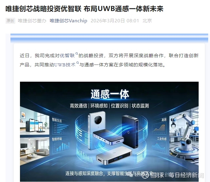 消息,近日,公司完成对优智联的战略投资,双方将开展深度战略合作,联合打造创新产品,共同推动UWB技术与通感一体方案在多领域的规模化落地。