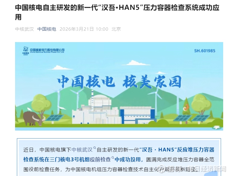 每经AI快讯,3月21日,据中国核电消息,近日,中国核电旗下中核武汉自主研发的新一代“汉吾・HAN5”反应堆压力容器检查系统在三门核电3号机组役前检查中成功投用,圆满完成反应堆压力容器全范围役前检查任务。相较于传统检测系统,“汉吾·HAN5”将压力容器检查关键路径时间缩短三天以上,不仅适用于二代加堆型,亦可适配AP1000、“华龙一号”等多种主力堆型,全面满足ASME及RSE-M等国际在役检查法规要求,具备较强的通用性与推广价值。
