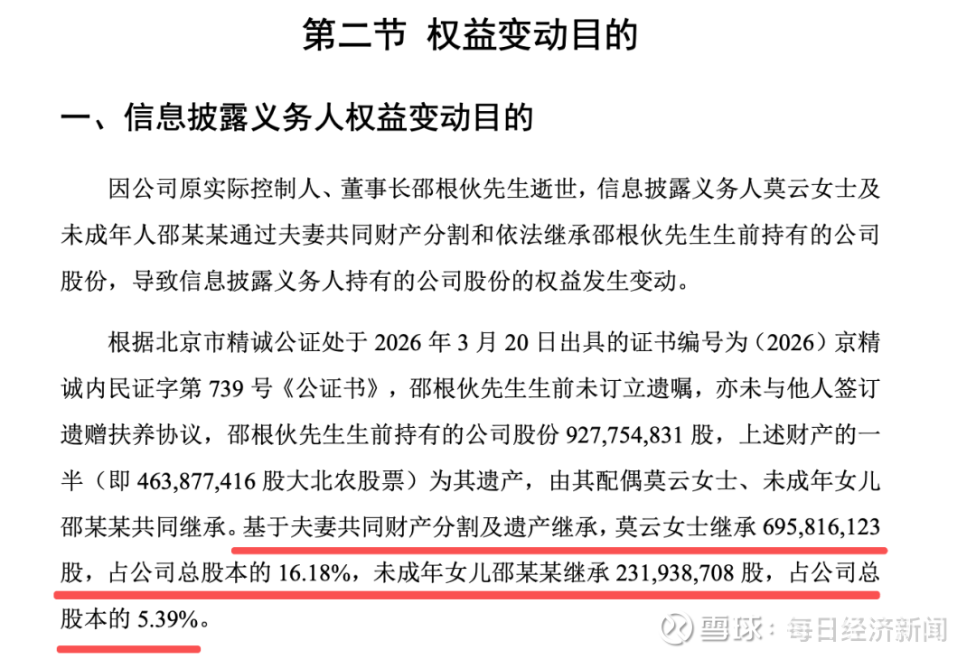 根据北京市精诚公证处出具的《公证书》,邵根伙生前未订立遗嘱,亦未与他人签订遗赠扶养协议,邵根伙生前持有的公司股份中的一半(即4.64亿股大北农股票)为其遗产,由其配偶莫云、未成年女儿邵某某共同继承。基于夫妻共同财产分割及遗产继承,莫云继承6.96亿股股票,占公司总股本的16.18%;未成年女儿邵某某继承2.32亿股股票,占公司总股本的5.39%。