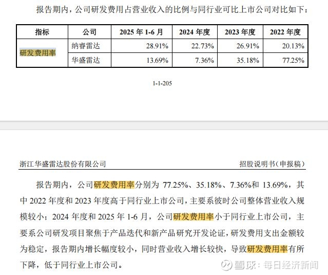 华盛雷达招股书解释称,2024年研发费用率偏低系因研发项目聚焦产品迭代及新产品论证,支出金额稳定,加之营收增长较快所致。