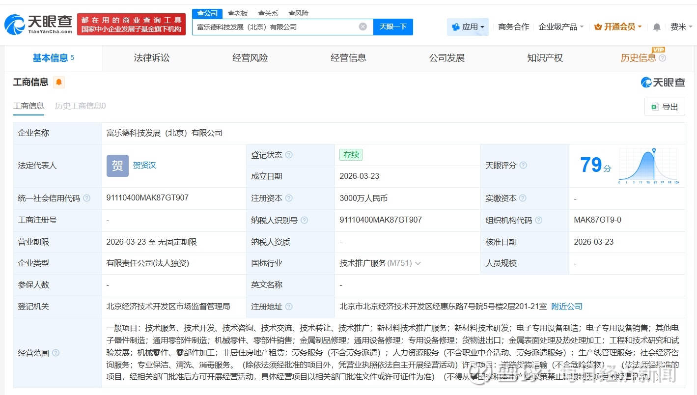 每经AI快讯,天眼查App显示,近日,富乐德科技发展(北京)有限公司成立,法定代表人为贺贤汉,注册资本3000万元人民币,经营范围包括新材料技术研发、新材料技术推广服务、电子专用设备制造、电子专用设备销售等,由富乐德(301297)全资持股。