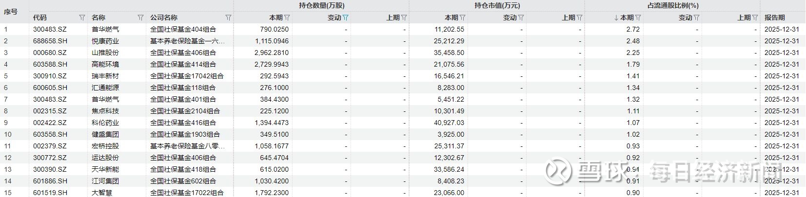 A股上市公司2025年年报持续披露,社保基金重仓流通股的情况也陆续更新。