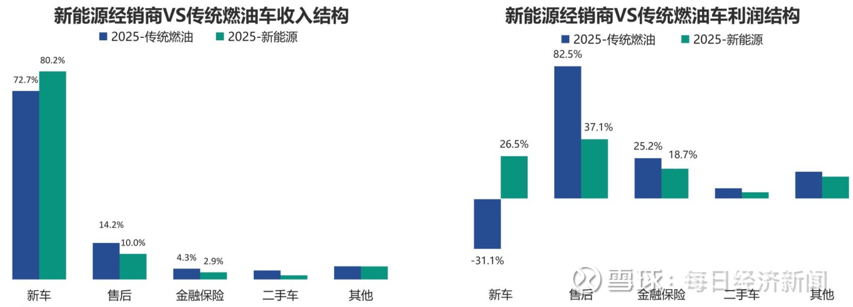 从业绩表现来看,2025年新能源汽车品牌经销商或代理商在调查样本中的占比升至29.9%,较2024年的16.8%大幅提升,其新车销售毛利贡献达26.5%,售后和金融保险的毛利贡献分别为37.1%和18.7%,经营表现显著优于行业整体。与之相对应,传统燃油车经销商的新车毛利为-31.1%。