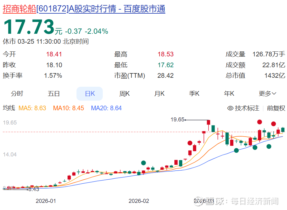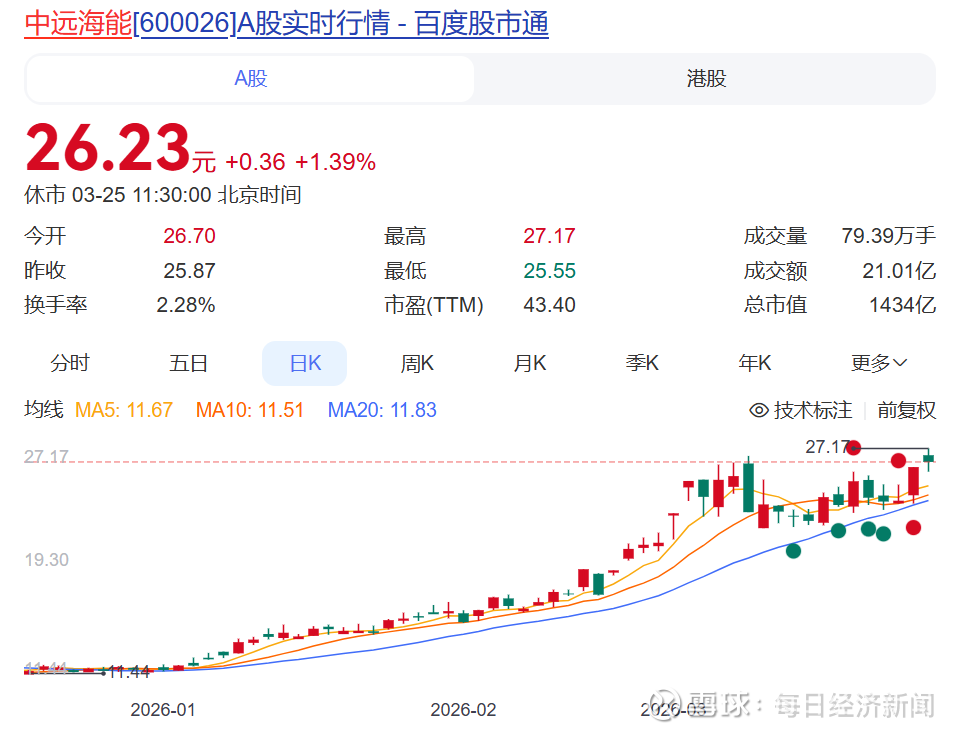 除中远海能外,招商轮船证券部人士25日透露,目前公司没有船舶滞留波斯湾,战争后也没有通过风险区域的计划,而是走其他运输航线,目前油轮运价比战争前上涨超50%。