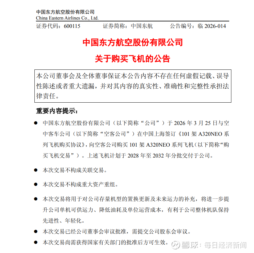 3月25日,中国东方航空股份有限公司(中国东航,600115.SH)公告称,公司于2026年3月25日与空中客车公司在中国上海签订《101架A320NEO系列飞机购买协议》,向空客公司购买101架A320NEO系列飞机。上述飞机计划于2028年至2032年分批交付于公司。