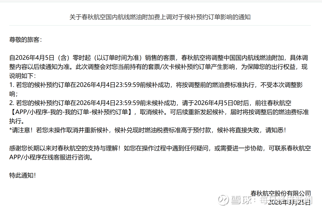 春秋航空发3月25日通知称,自2026年4月5日(含)零时起(以订单时间为准)销售的客票,将上调国内航线燃油附加费,具体调整内容以后续通知为准。