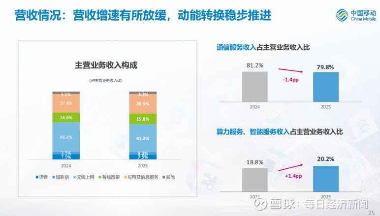 通信服务收入占主营业务收入比为79.8%根据财报数据,中国移动2025年营运收入为1.05万亿元,同比增长0.9%;主营业务收入8955亿元,同比增长0.7%;通信服务收入占主营业务收入比为79.8%;算力服务、智能服务收入占主营业务收入比为20.2%,同比提升1.4个百分点。