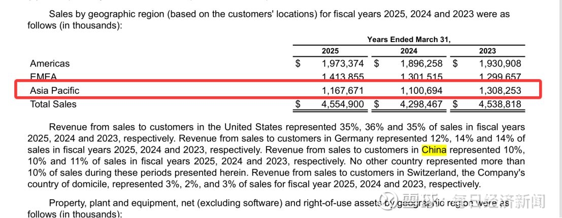 据罗技披露的2025财年报告,公司将销售和营销活动区域分为三大区域:美洲、EMEA(欧洲、中东和非洲)、亚太地区(中国、澳大利亚、日本、印度等)。2025财年,罗技在亚太地区的销售额为11.68亿美元。公司在财报中提到,来自中国客户的销售收入占10%。