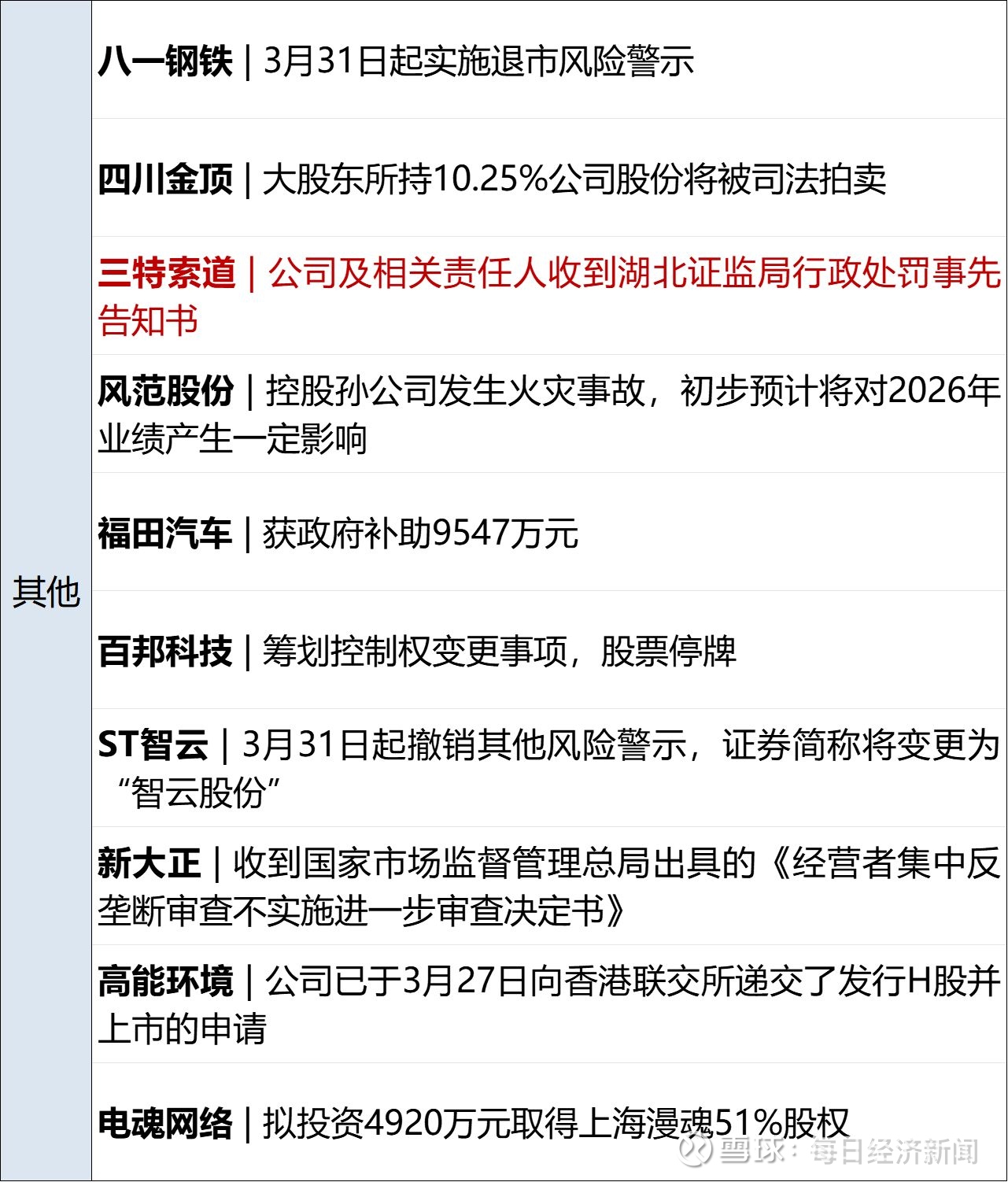 宇树科技:3月29日,宇树科技创始人、CEO王兴兴亮相2026中国网络媒体论坛,以《当机器人刷屏》为题发表演讲。他个人定义具身智能的“GPT时刻”为:带一台机器人到陌生场景,通过语音指令,机器人能完成80%到90%的任务。王兴兴表示,具身智能的“GPT时刻大概还要两到三年到来。“可能很快,也可能慢一点,但今年或明年一定会有非常大的技术进步在等待着大家。” (证券时报)