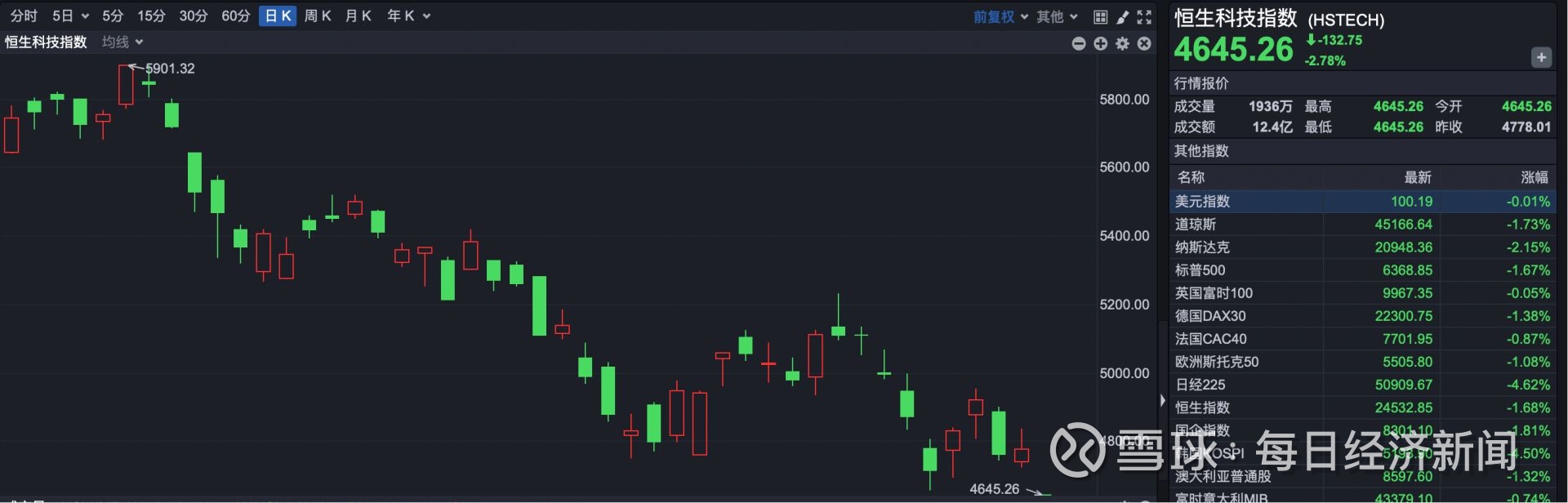 恒生科技指数开盘报4645.26点,下跌132.75点,跌幅2.78%。