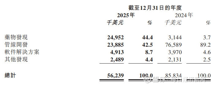 与2024年相比,公司的收入结构呈现显著变化。具体来看,药物发现业务收入同比激增693.6%至2495.2万美元,占总营收比重从3.7%跃升至44.4%;管线开发收入从7658.9万美元降至2388.5万美元,占比从89.2%滑落至42.5%;软件解决方案收入稳步增长23.8%至491.3万美元。