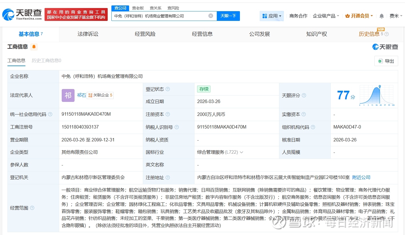 每经AI快讯,天眼查App显示,近日,中免(呼和浩特)机场商业管理有限公司成立,法定代表人为祁石,注册资本2000万元人民币,经营范围包括商业综合体管理服务、航空运输货物打包服务、销售代理等,由中免(北京)商贸有限公司、内蒙古空港商业管理有限责任公司共同持股。