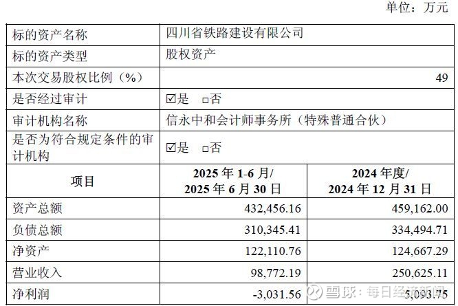 标的2025年上半年亏损超3000万元据四川路桥披露的标的公司经审计的财务信息,四川铁建2024年实现营收约25.06亿元、实现净利润5093.75万元;2025年上半年实现营收约9.88亿元、实现净利润-3031.56万元。