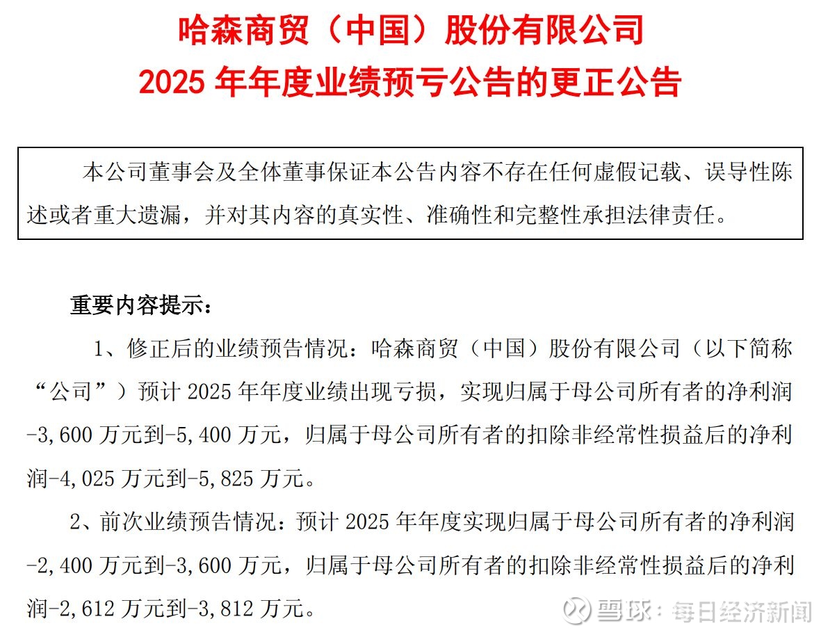 4月2日晚间,哈森股份(SH603958,股价20.05元,市值43.98亿元)就2025年年度业绩预亏公告进行了更正,将此前预计的年度亏损区间从2400万元至3600万元下修至3600万元至5400万元。