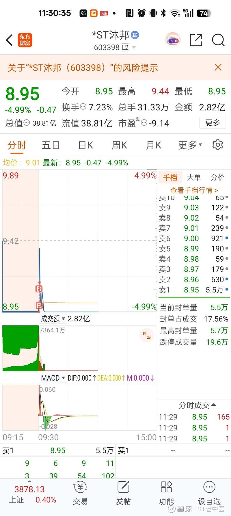 还是坚持自己观点实控人立案是利好,但是进监管会影响短期情绪。今天盘面也很明显,散户疯狂出逃,主力大口吃饱。主力不断的后面增加压单,前面小单吃筹码,这么个盘面,国庆后高开高走缩量涨停的概率很大。监管的面子给了,既然已经进监管了,调整一天后,下一个目标只有一个,停牌进小黑屋。昨晚挂跌停一笔,撬开后又助力一笔。其他东西假期再谈,沐邦这一两天一个公告的速度,假期随便出点消息,放假回来就买不进去。